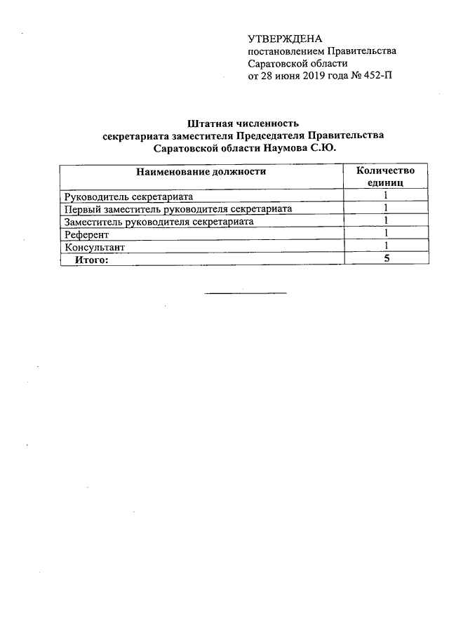 Постановление Правительства Саратовской области от 28.06.2019 N 452-П "Об образовании и утверждении штатной численности секретариата заместителя Председателя Правительства Саратовской области Наумова С.Ю."