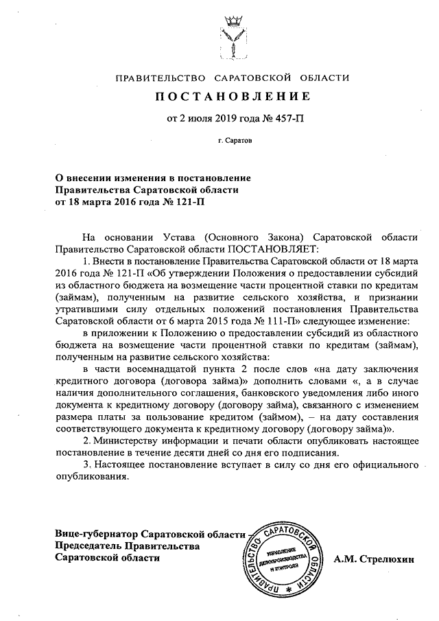 Постановление Правительства Саратовской области от 02.07.2019 N 457-П "О внесении изменения в постановление Правительства Саратовской области от 18 марта 2016 года N 121-П"