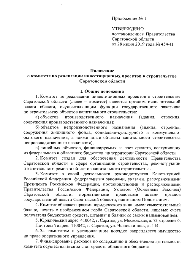 Постановление Правительства Саратовской области от 28.06.2019 N 454-П "О создании комитета по реализации инвестиционных проектов в строительстве Саратовской области" (вместе с "Положением о комитете по реализации инвестиционных проектов в строительстве Саратовской области", "Перечнем организаций, подведомственных комитету по реализации инвестиционных проектов в строительстве Саратовской области")
