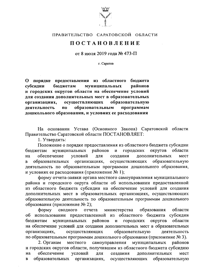 Постановление Правительства Саратовской области от 08.07.2019 N 473-П "О Порядке предоставления из областного бюджета субсидии бюджетам муниципальных районов и городских округов области на обеспечение условий для создания дополнительных мест в образовательных организациях, осуществляющих образовательную деятельность по образовательным программам дошкольного образования, и условиях ее расходования"