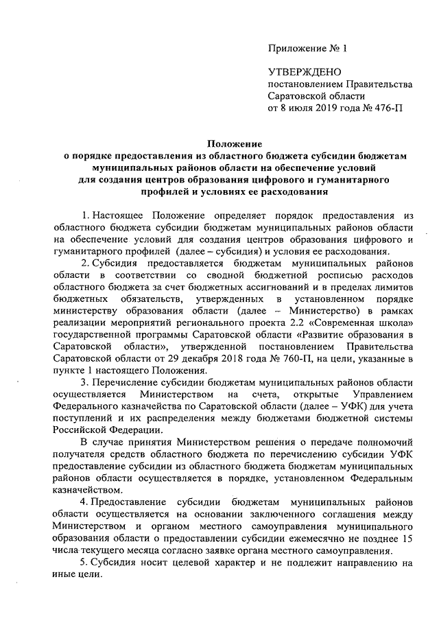 Постановление Правительства Саратовской области от 08.07.2019 N 476-П "О порядке предоставления из областного бюджета субсидии бюджетам муниципальных районов области на обеспечение условий для создания центров образования цифрового и гуманитарного профилей и условиях ее расходования" (вместе с "Положением о порядке предоставления из областного бюджета субсидии бюджетам муниципальных районов области на обеспечение условий для создания центров образования цифрового и гуманитарного профилей и условиях ее расходования")