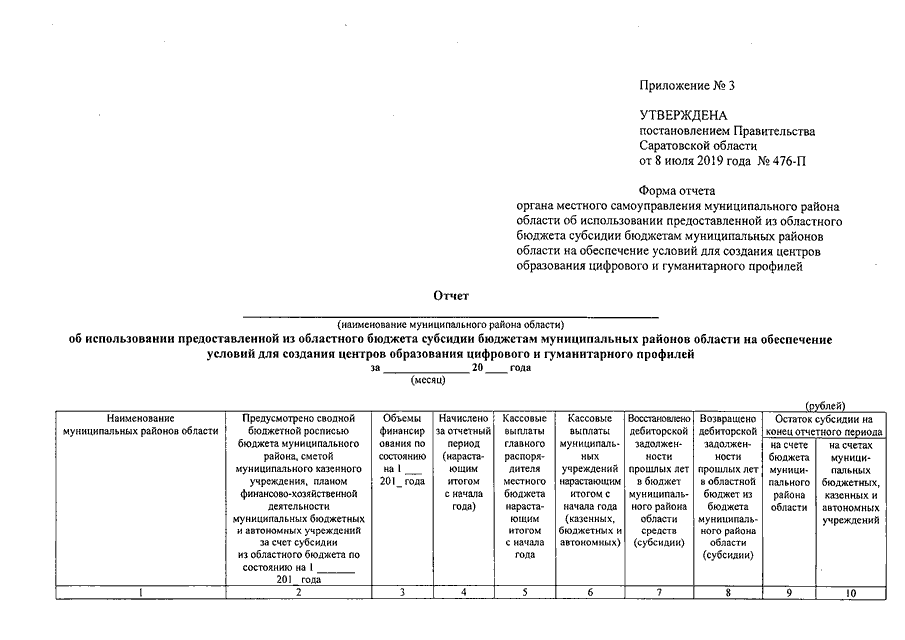 Постановление Правительства Саратовской области от 08.07.2019 N 476-П "О порядке предоставления из областного бюджета субсидии бюджетам муниципальных районов области на обеспечение условий для создания центров образования цифрового и гуманитарного профилей и условиях ее расходования" (вместе с "Положением о порядке предоставления из областного бюджета субсидии бюджетам муниципальных районов области на обеспечение условий для создания центров образования цифрового и гуманитарного профилей и условиях ее расходования")