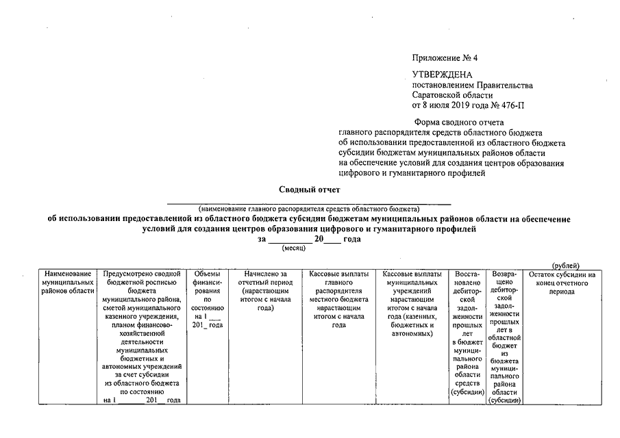 Постановление Правительства Саратовской области от 08.07.2019 N 476-П "О порядке предоставления из областного бюджета субсидии бюджетам муниципальных районов области на обеспечение условий для создания центров образования цифрового и гуманитарного профилей и условиях ее расходования" (вместе с "Положением о порядке предоставления из областного бюджета субсидии бюджетам муниципальных районов области на обеспечение условий для создания центров образования цифрового и гуманитарного профилей и условиях ее расходования")