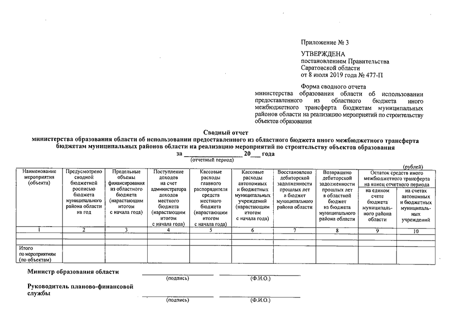 Постановление Правительства Саратовской области от 08.07.2019 N 477-П "О порядке предоставления из областного бюджета иного межбюджетного трансферта бюджетам муниципальных районов области на реализацию мероприятий по строительству объектов образования" (вместе с "Положением о порядке предоставления из областного бюджета иного межбюджетного трансферта бюджетам муниципальных районов области на реализацию мероприятий по строительству объектов образования")