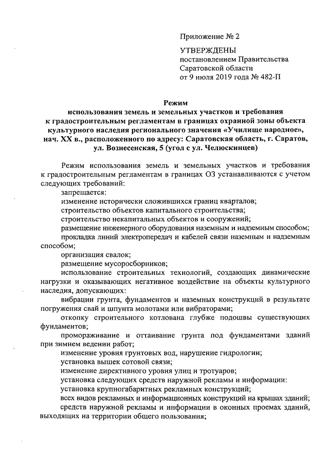 Постановление Правительства Саратовской области от 09.07.2019 N 482-П "Об утверждении зон охраны объекта культурного наследия регионального значения "Училище народное", нач. XX в., расположенного по адресу: Саратовская область, г. Саратов, ул. Вознесенская, 5 (угол с ул. Челюскинцев)"