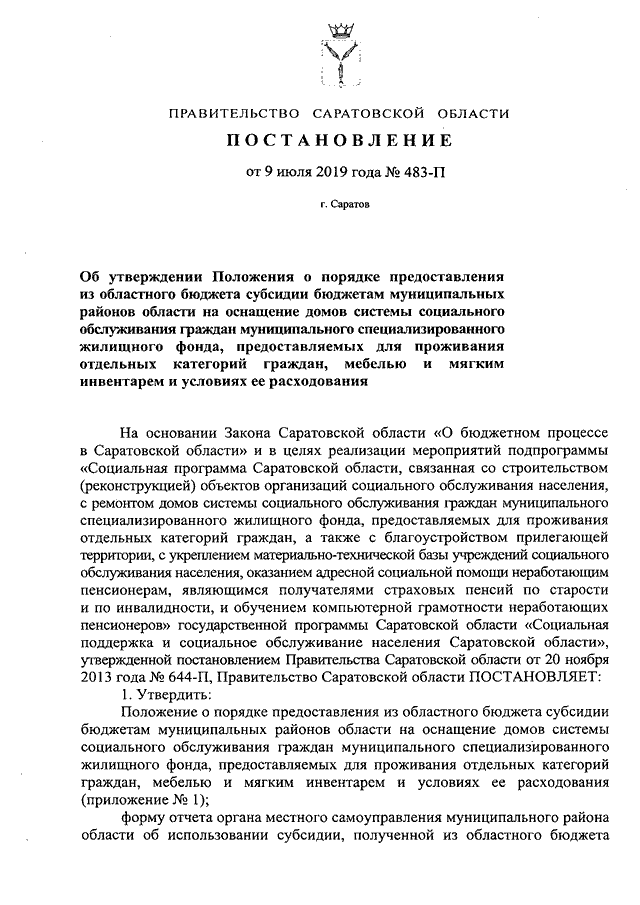 Постановление Правительства Саратовской области от 09.07.2019 N 483-П "Об утверждении Положения о порядке предоставления из областного бюджета субсидии бюджетам муниципальных районов области на оснащение домов системы социального обслуживания граждан муниципального специализированного жилищного фонда, предоставляемых для проживания отдельных категорий граждан, мебелью и мягким инвентарем и условиях ее расходования"