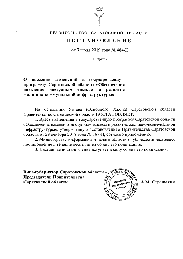 Постановление Правительства Саратовской области от 09.07.2019 N 484-П "О внесении изменений в государственную программу Саратовской области "Обеспечение населения доступным жильем и развитие жилищно-коммунальной инфраструктуры"