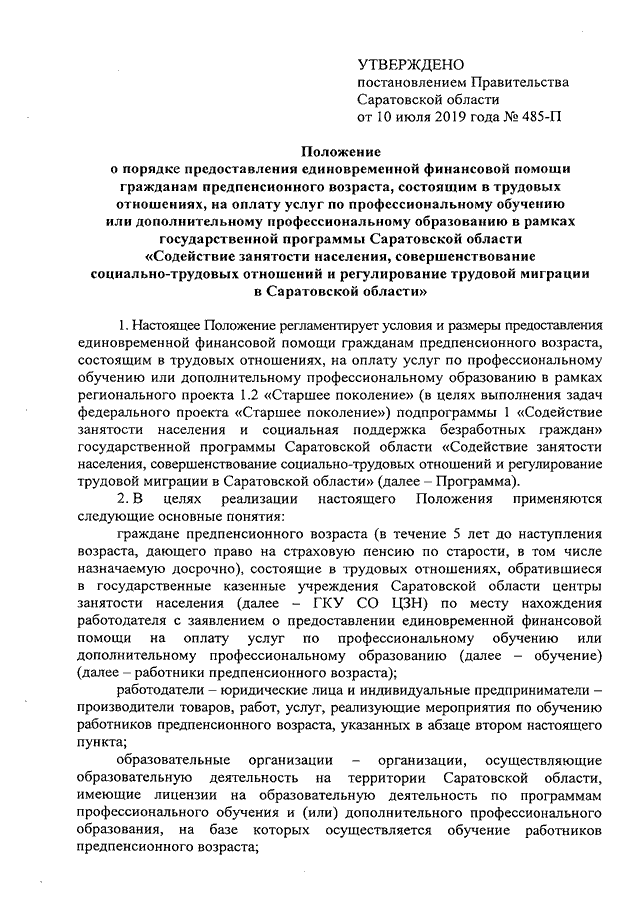 Постановление Правительства Саратовской области от 10.07.2019 N 485-П "Об утверждении Положения о порядке предоставления единовременной финансовой помощи гражданам предпенсионного возраста, состоящим в трудовых отношениях, на оплату услуг по профессиональному обучению или дополнительному профессиональному образованию в рамках государственной программы Саратовской области "Содействие занятости населения, совершенствование социально-трудовых отношений и регулирование трудовой миграции в Саратовской области"