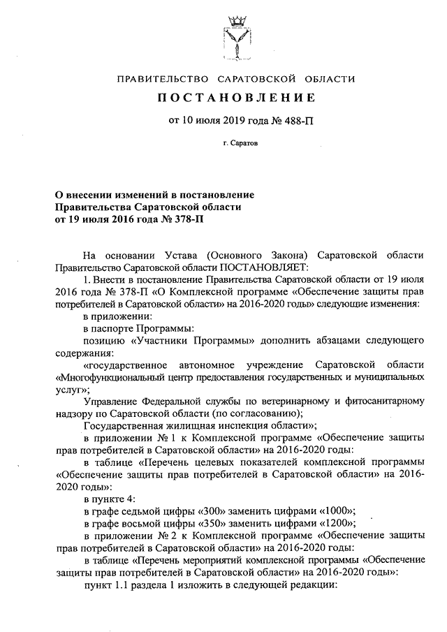 Постановление Правительства Саратовской области от 10.07.2019 N 488-П "О внесении изменений в постановление Правительства Саратовской области от 19 июля 2016 года N 378-П"