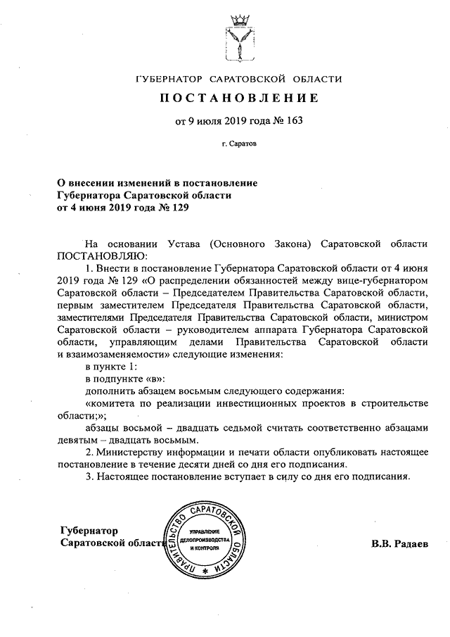 Постановление Губернатора Саратовской области от 09.07.2019 N 163 "О внесении изменений в постановление Губернатора Саратовской области от 4 июня 2019 года N 129"