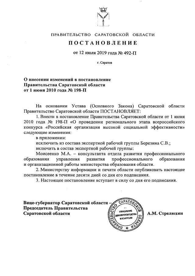 Постановление Правительства Саратовской области от 12.07.2019 N 492-П "О внесении изменений в постановление Правительства Саратовской области от 1 июня 2010 года N 198-П"
