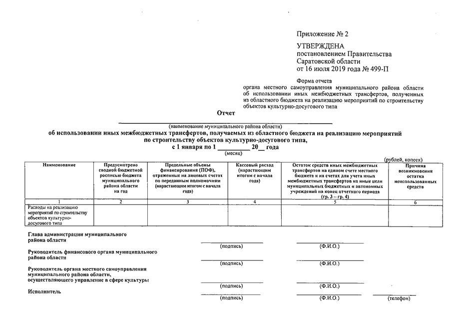 Постановление Правительства Саратовской области от 16.07.2019 N 499-П "О порядке предоставления из областного бюджета бюджетам муниципальных районов области иных межбюджетных трансфертов на реализацию мероприятий по строительству объектов культурно-досугового типа" (вместе с "Положением о порядке предоставления из областного бюджета бюджетам муниципальных районов области иных межбюджетных трансфертов на реализацию мероприятий по строительству объектов культурно-досугового типа")