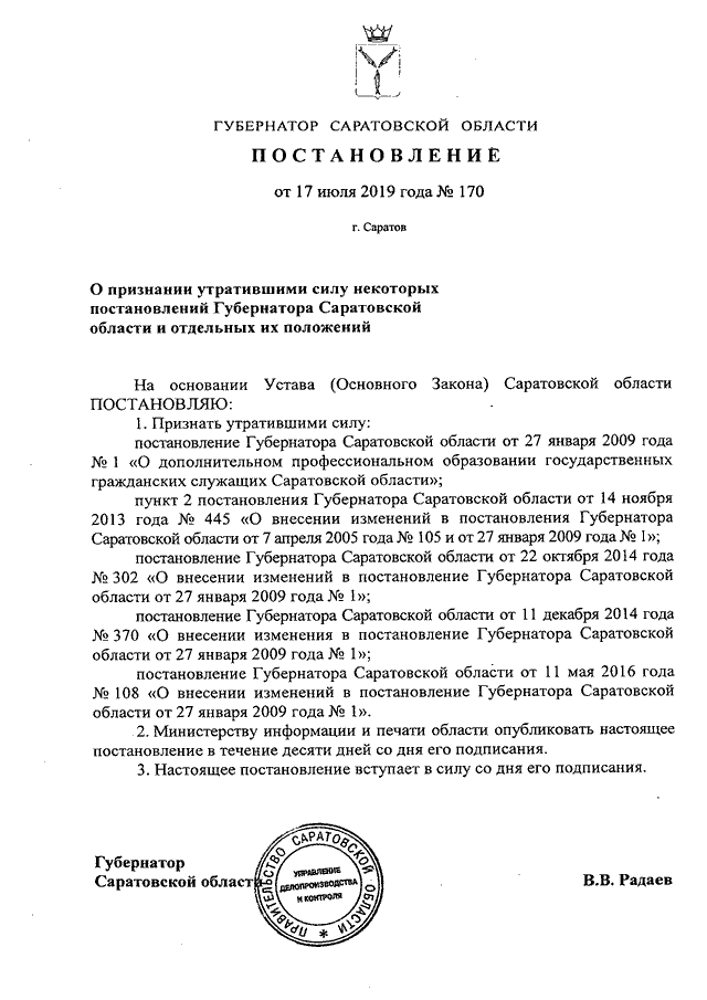 Постановление Губернатора Саратовской области от 17.07.2019 N 170 "О признании утратившими силу некоторых постановлений Губернатора Саратовской области и отдельных их положений"