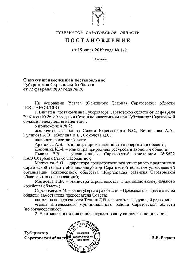 Постановление Губернатора Саратовской области от 19.07.2019 N 172 "О внесении изменений в постановление Губернатора Саратовской области от 22 февраля 2007 года N 26"