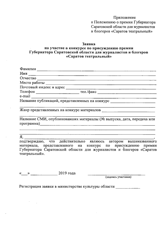 Постановление Губернатора Саратовской области от 19.07.2019 N 174 "О премии Губернатора Саратовской области для журналистов и блогеров "Саратов театральный" (вместе с "Положением о премии Губернатора Саратовской области для журналистов и блогеров "Саратов театральный")