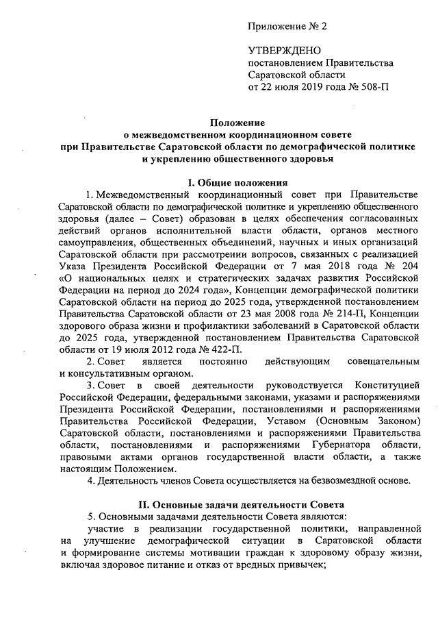 Постановление Правительства Саратовской области от 22.07.2019 N 508-П "О создании межведомственного координационного совета при Правительстве Саратовской области по демографической политике и укреплению общественного здоровья" (вместе с "Положением о межведомственном координационном совете при Правительстве Саратовской области по демографической политике и укреплению общественного здоровья")