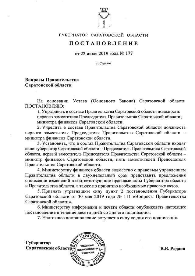 Постановление Губернатора Саратовской области от 22.07.2019 N 177 "Вопросы Правительства Саратовской области"