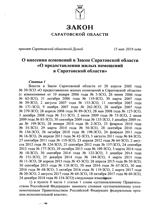 Закон Саратовской области от 22.05.2019 N 39-ЗСО "О внесении изменений в Закон Саратовской области "О предоставлении жилых помещений в Саратовской области" (принят Саратовской областной Думой 15.05.2019)