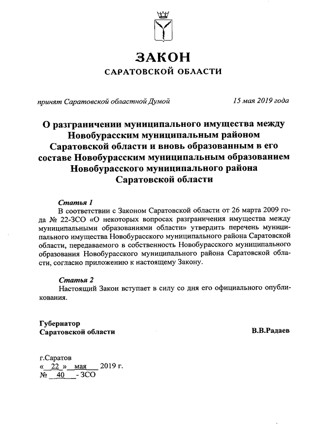 Закон Саратовской области от 22.05.2019 N 40-ЗСО "О разграничении муниципального имущества между Новобурасским муниципальным районом Саратовской области и вновь образованным в его составе Новобурасским муниципальным образованием Новобурасского муниципального района Саратовской области" (принят Саратовской областной Думой 15.05.2019) (вместе с "Перечнем имущества, передаваемого из собственности Новобурасского муниципального района Саратовской области в собственность Новобурасского муниципального образования Новобурасского муниципального района Саратовской области")