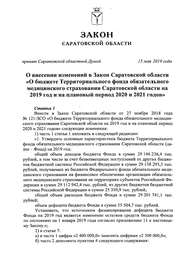 Закон Саратовской области от 22.05.2019 N 43-ЗСО "О внесении изменений в Закон Саратовской области "О бюджете Территориального фонда обязательного медицинского страхования Саратовской области на 2019 год и на плановый период 2020 и 2021 годов" (принят Саратовской областной Думой 15.05.2019)