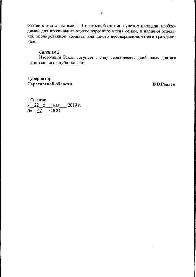 Закон Саратовской области от 22.05.2019 N 47-ЗСО "О внесении изменения в статью 2 Закона Саратовской области "О предоставлении жилых помещений в Саратовской области" (принят Саратовской областной Думой 15.05.2019)