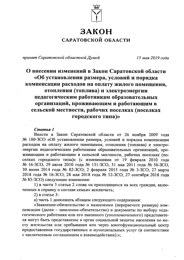 Закон Саратовской области от 22.05.2019 N 48-ЗСО "О внесении изменений в Закон Саратовской области "Об установлении размера, условий и порядка компенсации расходов на оплату жилого помещения, отопления (топлива) и электроэнергии педагогическим работникам образовательных организаций, проживающим и работающим в сельской местности, рабочих поселках (поселках городского типа)" (принят Саратовской областной Думой 15.05.2019)
