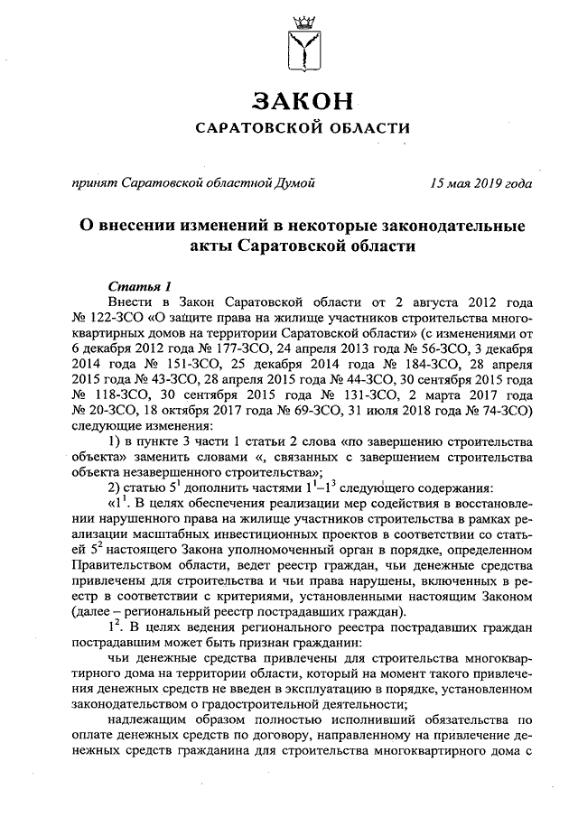 Закон Саратовской области от 22.05.2019 N 49-ЗСО "О внесении изменений в некоторые законодательные акты Саратовской области" (принят Саратовской областной Думой 15.05.2019)