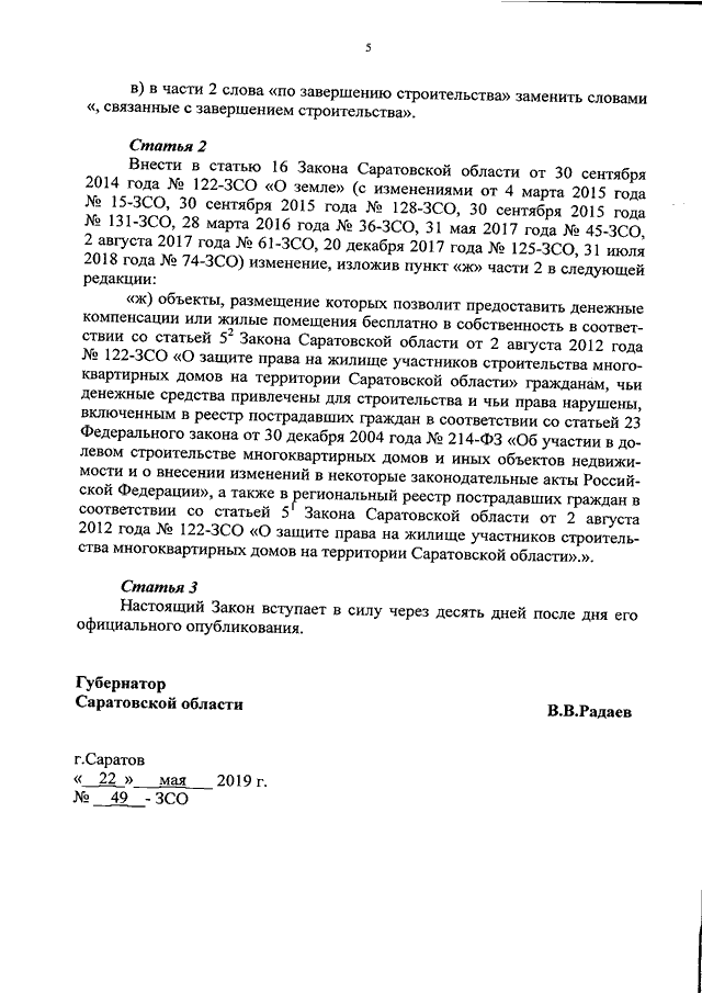 Закон Саратовской области от 22.05.2019 N 49-ЗСО "О внесении изменений в некоторые законодательные акты Саратовской области" (принят Саратовской областной Думой 15.05.2019)
