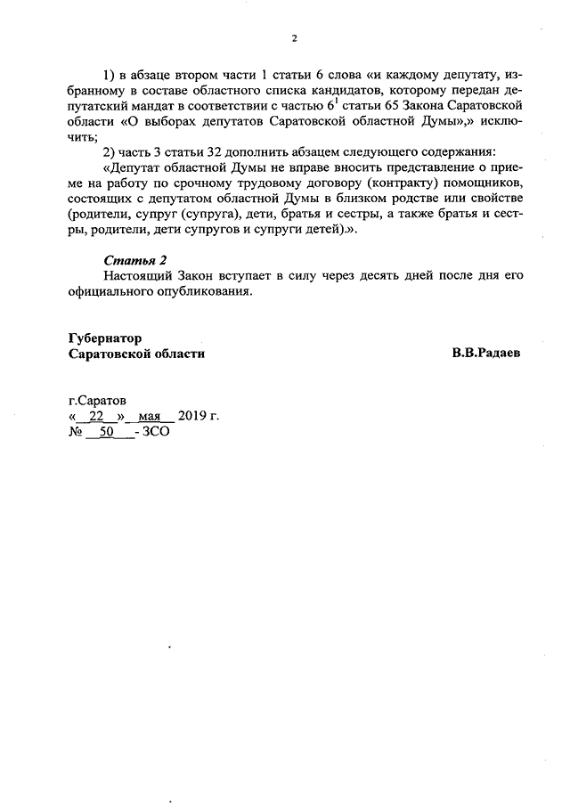 Закон Саратовской области от 22.05.2019 N 50-ЗСО "О внесении изменений в Закон Саратовской области "О статусе депутата Саратовской областной Думы" (принят Саратовской областной Думой 15.05.2019)