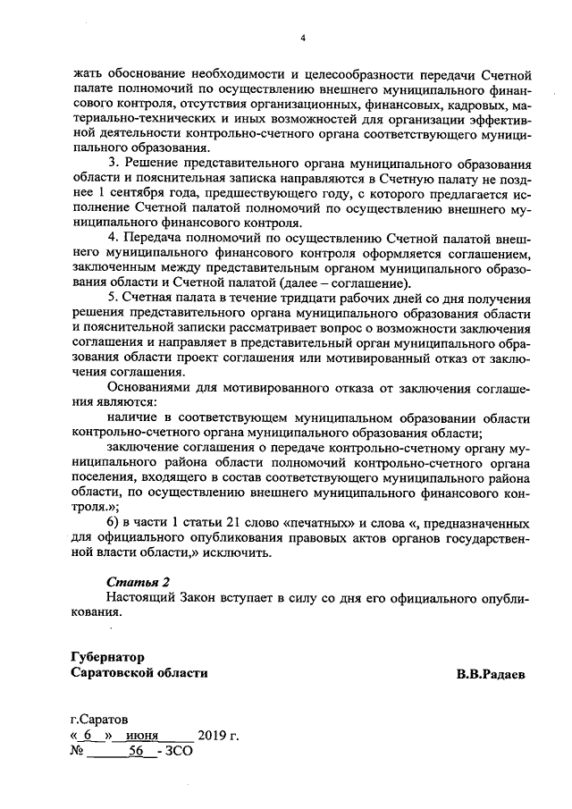 Закон Саратовской области от 06.06.2019 N 56-ЗСО "О внесении изменений в Закон Саратовской области "О Счетной палате Саратовской области" (принят Саратовской областной Думой 31.05.2019)