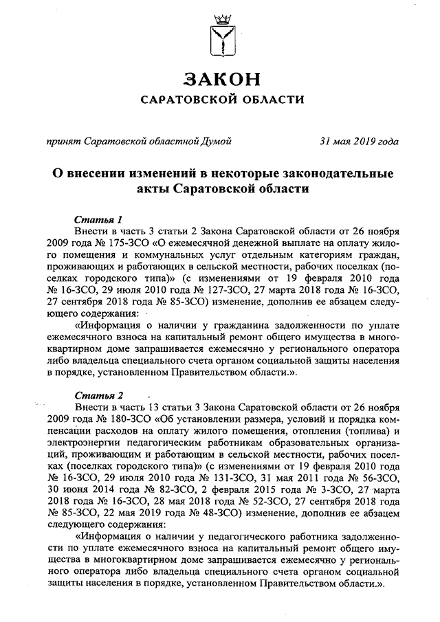 Закон Саратовской области от 06.06.2019 N 57-ЗСО "О внесении изменений в некоторые законодательные акты Саратовской области" (принят Саратовской областной Думой 31.05.2019)