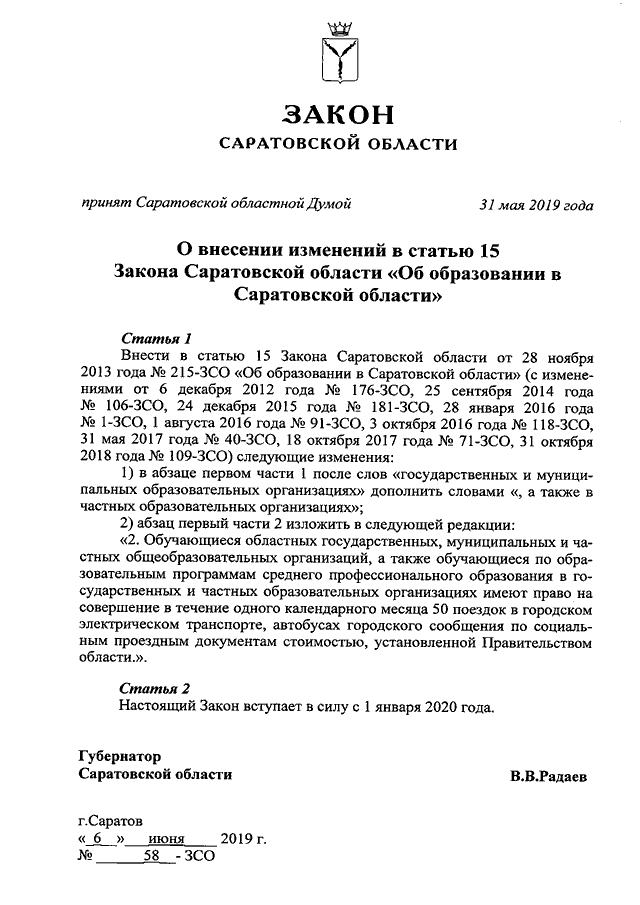 Закон Саратовской области от 06.06.2019 N 58-ЗСО "О внесении изменений в статью 15 Закона Саратовской области "Об образовании в Саратовской области" (принят Саратовской областной Думой 31.05.2019)