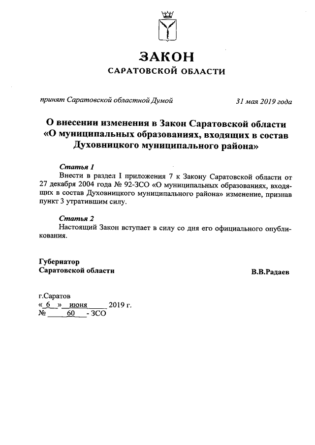 Закон Саратовской области от 06.06.2019 N 60-ЗСО "О внесении изменения в Закон Саратовской области "О муниципальных образованиях, входящих в состав Духовницкого муниципального района" (принят Саратовской областной Думой 31.05.2019)