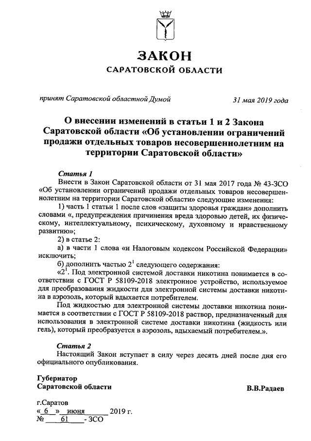 Закон Саратовской области от 06.06.2019 N 61-ЗСО "О внесении изменений в статьи 1 и 2 Закона Саратовской области "Об установлении ограничений продажи отдельных товаров несовершеннолетним на территории Саратовской области" (принят Саратовской областной Думой 31.05.2019)
