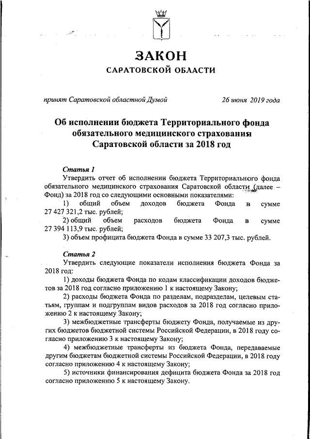 Закон Саратовской области от 03.07.2019 N 70-ЗСО "Об исполнении бюджета территориального фонда обязательного медицинского страхования Саратовской области за 2018 год" (принят Саратовской областной Думой 26.06.2019)