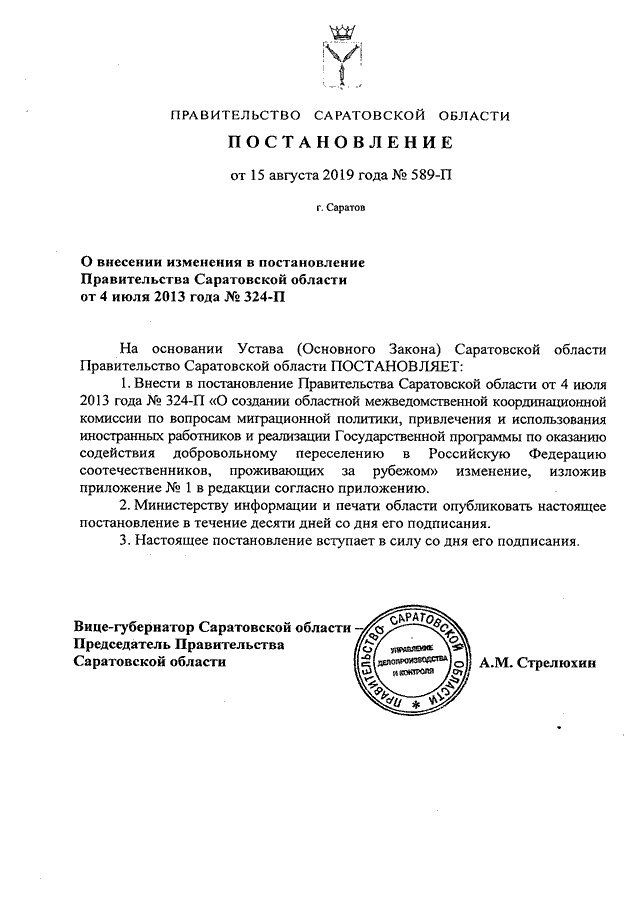 Постановление Правительства Саратовской области от 15.08.2019 N 589-П "О внесении изменения в постановление Правительства Саратовской области от 4 июля 2013 года N 324-П"