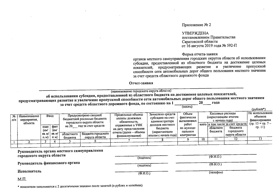 Постановление Правительства Саратовской области от 16.08.2019 N 592-П "О Порядке предоставления из областного бюджета субсидии бюджетам городских округов области на достижение целевых показателей, предусматривающих развитие и увеличение пропускной способности сети автомобильных дорог общего пользования местного значения за счет средств областного дорожного фонда, и условиях ее расходования" (вместе с "Положением о порядке предоставления из областного бюджета субсидии бюджетам городских округов области на достижение целевых показателей, предусматривающих развитие и увеличение пропускной способности сети автомобильных дорог общего пользования местного значения за счет средств областного дорожного фонда, и условиях ее расходования")