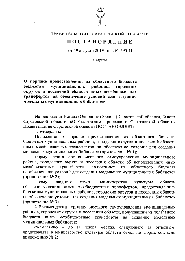 Постановление Правительства Саратовской области от 19.08.2019 N 595-П "О порядке предоставления из областного бюджета бюджетам муниципальных районов, городских округов и поселений области иных межбюджетных трансфертов на обеспечение условий для создания модельных муниципальных библиотек" (вместе с "Положением о порядке предоставления из областного бюджета бюджетам муниципальных районов, городских округов и поселений области иных межбюджетных трансфертов на обеспечение условий для создания модельных муниципальных библиотек")