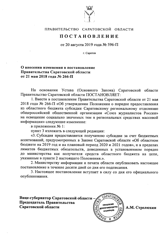 Постановление Правительства Саратовской области от 20.08.2019 N 596-П "О внесении изменения в постановление Правительства Саратовской области от 21 мая 2018 года N 266-П"