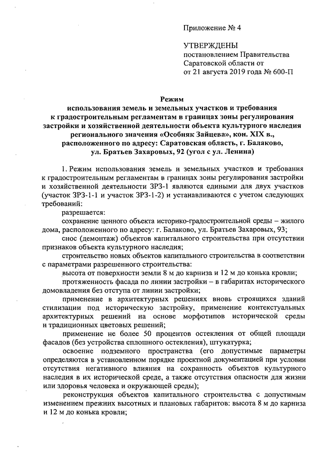 Постановление Правительства Саратовской области от 21.08.2019 N 600-П "Об утверждении зон охраны объекта культурного наследия регионального значения "Особняк Зайцева", кон. XIX в., расположенного по адресу: Саратовская область, г. Балаково, ул. Братьев Захаровых, 92 (угол с ул. Ленина)"