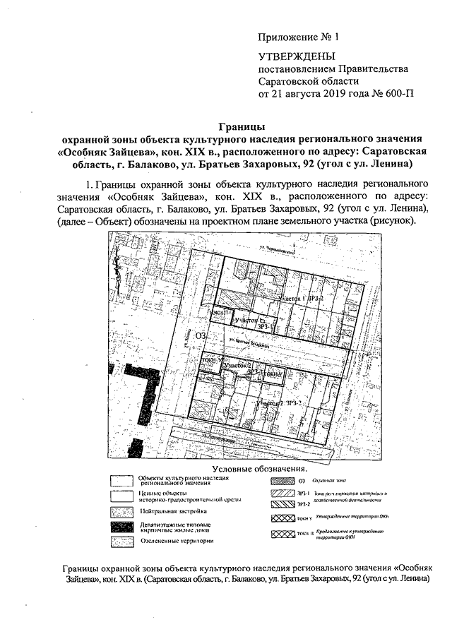 Постановление Правительства Саратовской области от 21.08.2019 N 600-П "Об утверждении зон охраны объекта культурного наследия регионального значения "Особняк Зайцева", кон. XIX в., расположенного по адресу: Саратовская область, г. Балаково, ул. Братьев Захаровых, 92 (угол с ул. Ленина)"