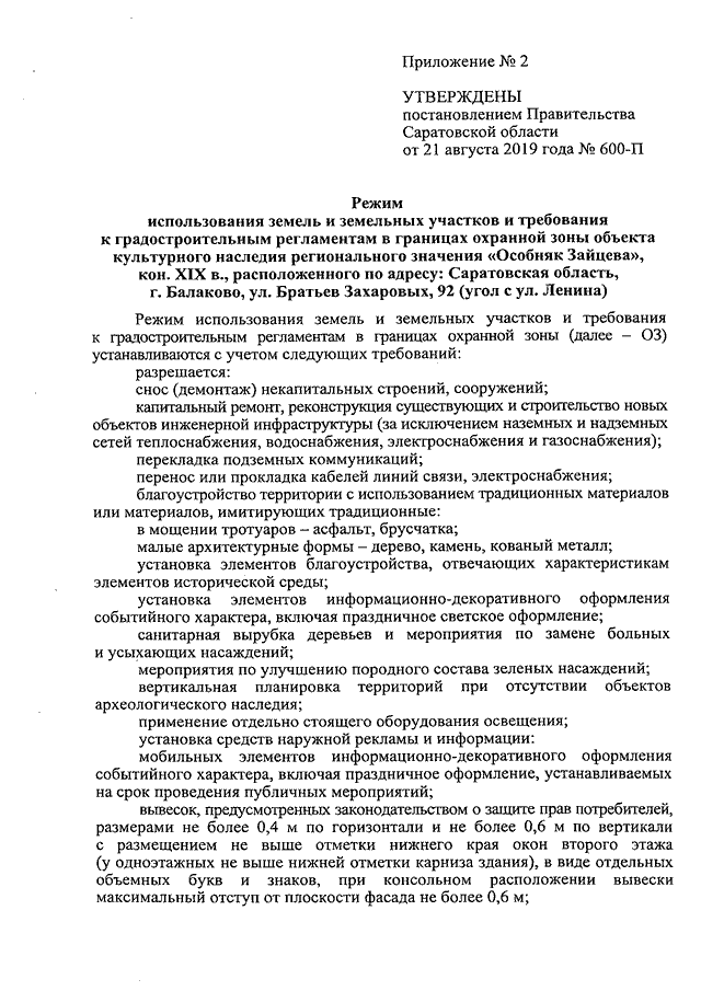 Постановление Правительства Саратовской области от 21.08.2019 N 600-П "Об утверждении зон охраны объекта культурного наследия регионального значения "Особняк Зайцева", кон. XIX в., расположенного по адресу: Саратовская область, г. Балаково, ул. Братьев Захаровых, 92 (угол с ул. Ленина)"