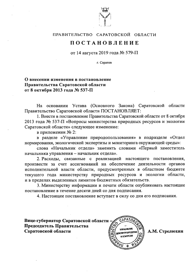 Постановление Правительства Саратовской области от 14.08.2019 N 579-П "О внесении изменения в постановление Правительства Саратовской области от 8 октября 2013 года N 537-П"
