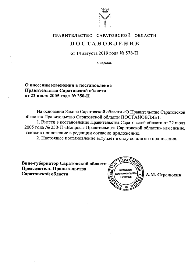 Постановление Правительства Саратовской области от 14.08.2019 N 578-П "О внесении изменения в постановление Правительства Саратовской области от 22 июля 2005 года N 250-П"