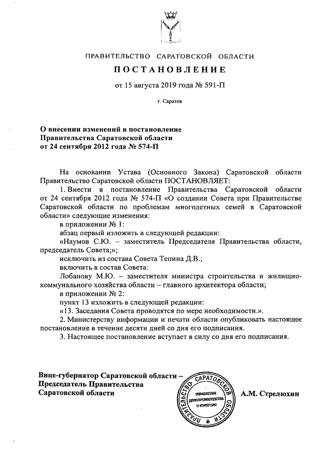 Постановление Правительства Саратовской области от 15.08.2019 N 591-П "О внесении изменений в постановление Правительства Саратовской области от 24 сентября 2012 года N 574-П"