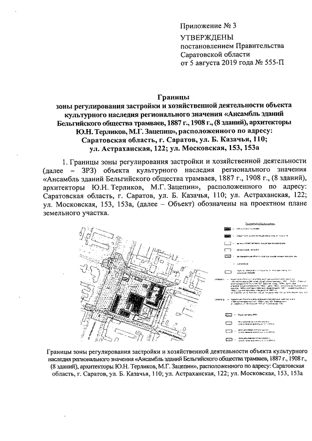 Постановление Правительства Саратовской области от 05.08.2019 N 555-П "Об утверждении зон охраны объекта культурного наследия регионального значения "Ансамбль зданий Бельгийского общества трамваев, 1887 г., 1908 г., (8 зданий), архитекторы Ю.Н. Терликов, М.Г. Зацепин", расположенного по адресу: Саратовская область, г. Саратов, ул. Б. Казачья, 110; ул. Астраханская, 122; ул. Московская, 153, 153а"
