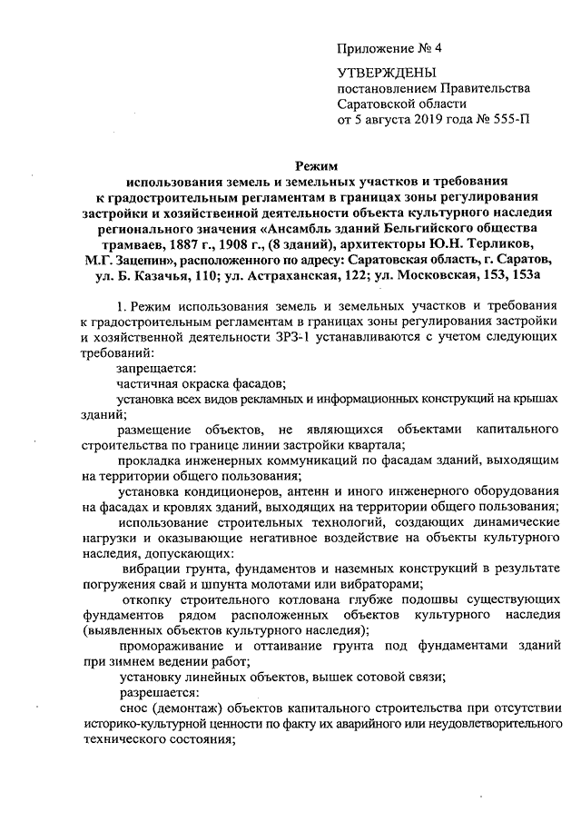 Постановление Правительства Саратовской области от 05.08.2019 N 555-П "Об утверждении зон охраны объекта культурного наследия регионального значения "Ансамбль зданий Бельгийского общества трамваев, 1887 г., 1908 г., (8 зданий), архитекторы Ю.Н. Терликов, М.Г. Зацепин", расположенного по адресу: Саратовская область, г. Саратов, ул. Б. Казачья, 110; ул. Астраханская, 122; ул. Московская, 153, 153а"