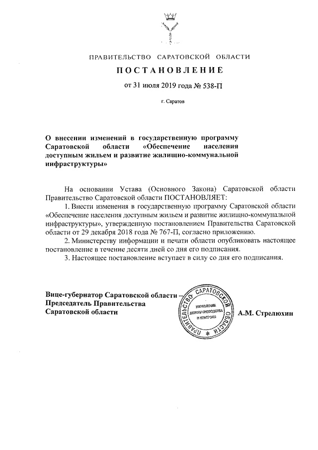 Постановление Правительства Саратовской области от 31.07.2019 N 538-П "О внесении изменений в государственную программу Саратовской области "Обеспечение населения доступным жильем и развитие жилищно-коммунальной инфраструктуры"