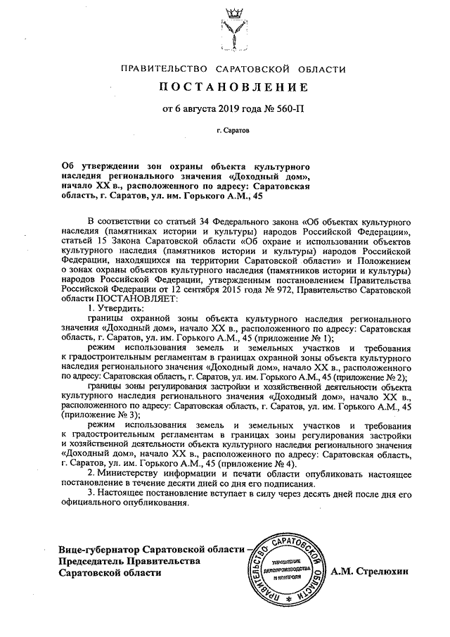 Постановление Правительства Саратовской области от 06.08.2019 N 560-П "Об утверждении зон охраны объекта культурного наследия регионального значения "Доходный дом", начало XX В., расположенного по адресу: Саратовская область, г. Саратов, ул. им. Горького А.М., 45"