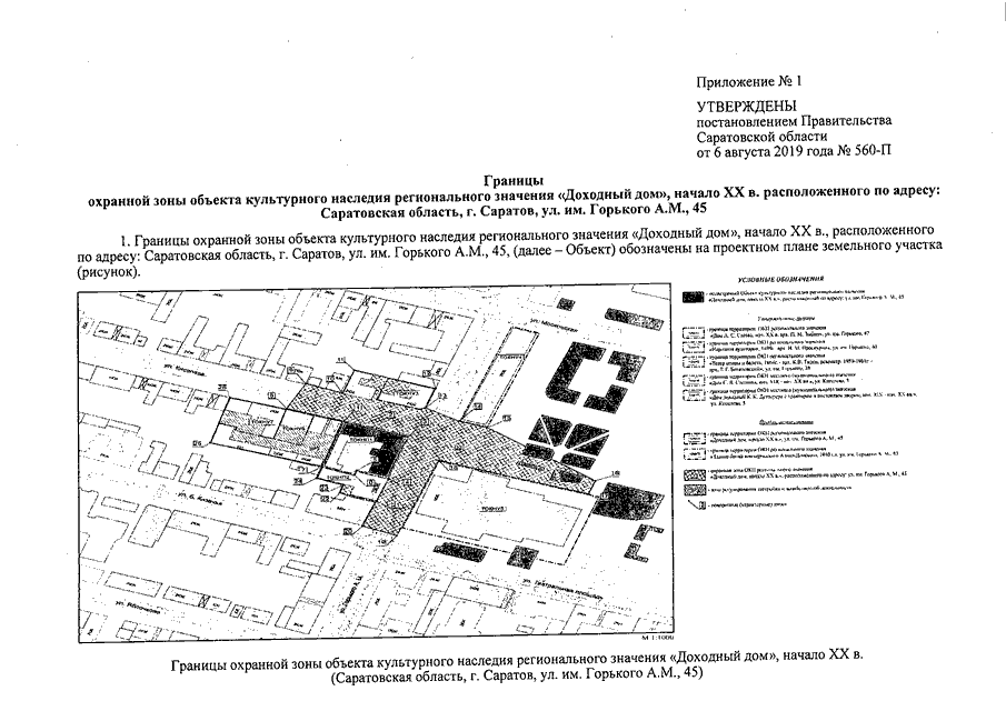 Постановление Правительства Саратовской области от 06.08.2019 N 560-П "Об утверждении зон охраны объекта культурного наследия регионального значения "Доходный дом", начало XX В., расположенного по адресу: Саратовская область, г. Саратов, ул. им. Горького А.М., 45"